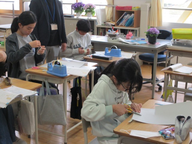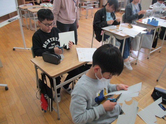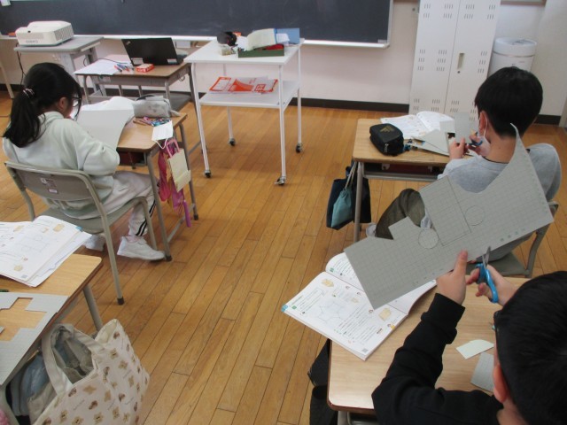 6年生が卒業し5年生だけになった教室では、5年生が真剣に、角柱や円柱の展開図を描き、切り抜いて立体をつくっていました。円柱は側面が底面の円の周りにきれいに貼り合わせるように正確に切り抜き、組み立てていました。