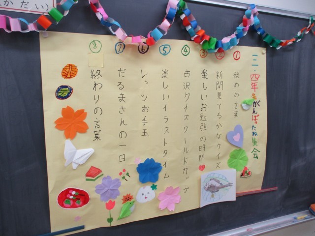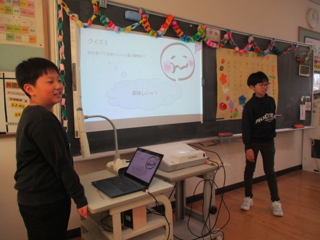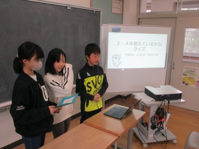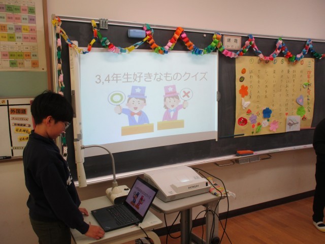 「3・4年生がんばったね集会」を開きました。前半はクイズの時間です。各係から、工夫を凝らしたクイズの出題があり、友達と相談しながら楽しみました。発表を分かりやすくするために、自分たちでスライドを作り、上手に活用していました。