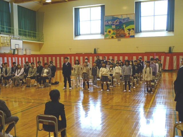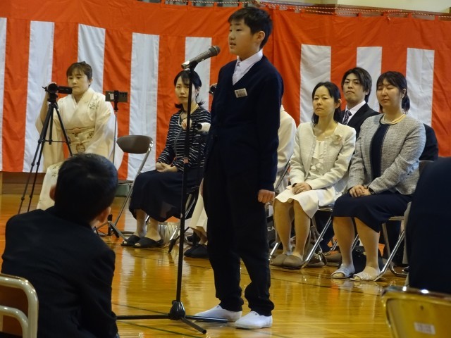入学式後、上級生から1年生への入学のお祝いのプレゼントとして、歌を歌いました。6年生代表の子が歓迎の言葉を話しました。1年生は、にこにこした笑顔で聞いていました。