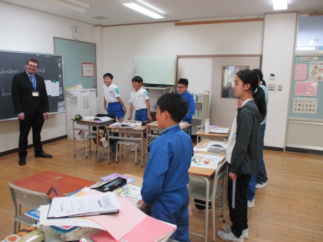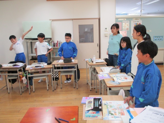チャンツに合わせて、楽しく外国語で表現しています。テンポが少しずつ速くなっても、ついていける6年生でした。