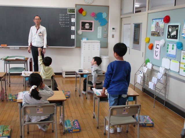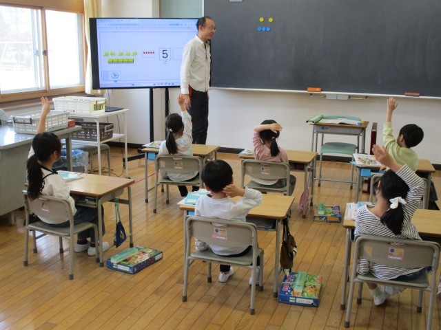 先生の話の聞き方も上手、手を挙げて発表するのも上手な1年生です。