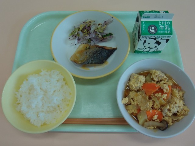 親子煮は、鶏肉(親)と卵(子)の他に、玉ねぎ、にんじん、じゃがいも、こんにゃく、しめじが入っています。