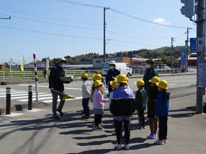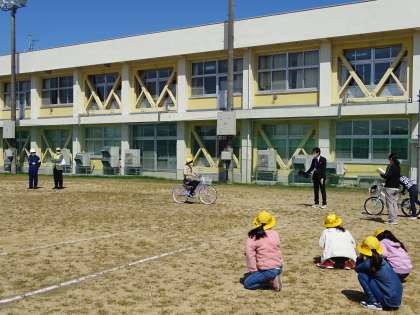 1、2年生は実地歩行訓練として古沢西交差点を実際に歩きました。また、3〜6年生は、安全な自転車の乗り方についての講義後、グラウンドで、実際に自転車に乗り、実技を行いました。