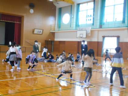 ラダーを使って、いろいろな跳び方を交代で行い、楽しみながら力を付けています。