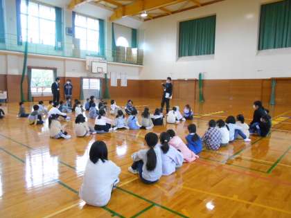 全校児童が体育館に集まり、跳躍のトレーニングを行いました。