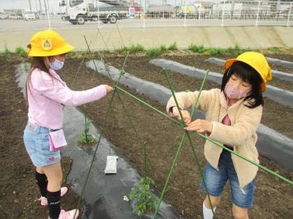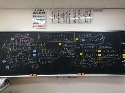 2年生の生活科では、夏野菜づくりに取り組んでいます。毎回の活動では、その日に行う活動の見通しを確認し、目当てを立てて時間いっぱい取り組んでいます。今の子供たちの悩みは、風の強い日に野菜が倒れたり折れたりしないように支えるためにはどのようなお世話をしてあげればよいかという点です。