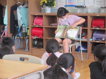 「ともだちごっこ」と言う、図書係のおすすめの本でした。読み聞かせのために一生懸命に練習した成果が出て、子供達は楽しそうに聞いていました。