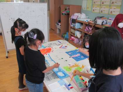 「夏といえば、やっぱりキャンプでしょ」「絵を見たら涼しくなるように、プールを描いたらいいんじゃないかな」などと話しながら、協力・分担し、楽しそうに描いていく子供たちです。