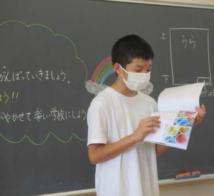 いよいよ2学期が始まりました。久しぶりに会った子供たちは元気いっぱいでした。今日は、始業式の後に、一人一研究の発表や2学期の目当てについての話合いをしました。今学期も一人一人の色を輝かせて、すてきな虹のような学級・学校をつくっていきましょう。
