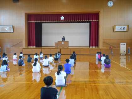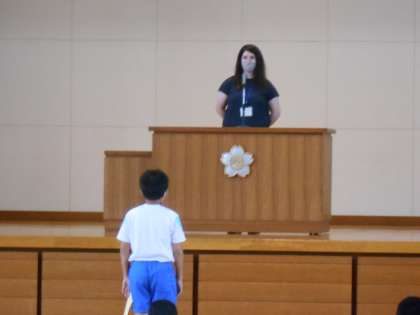 6年生の児童代表が英語で歓迎の挨拶をしました。子供たちも廊下でALTの先生に進んで挨拶するなど、外国語の学習をとても楽しみにしています。