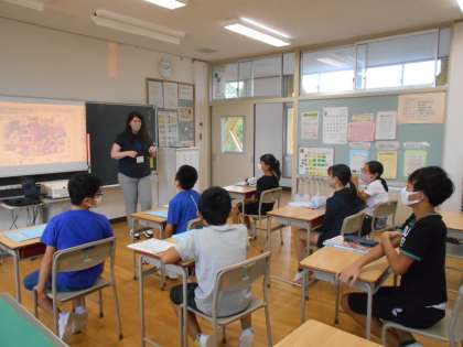 その後、5、6年生の外国語の授業があり、今まで習った英語を使いながら自己紹介をし、楽しく学習に取り組みました。