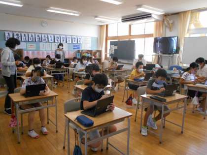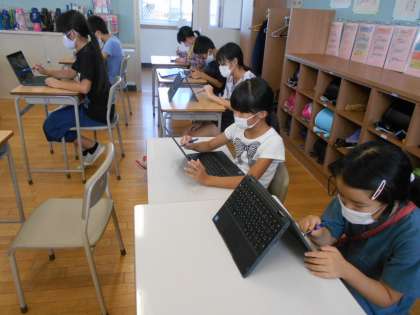 今日は、クロムブックを用いて、絵しりとりをしました。3グループに分かれ、グループ内で順番を決めて絵を描き、それに続けて次の人が絵でしりとりをします。最後に各グループの絵しりとりを見合いました。力作の絵を見合いながら盛り上がった活動時間となりました。