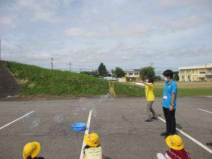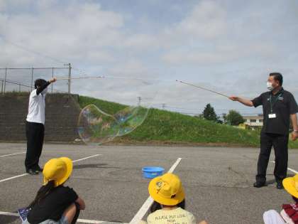 最後に、県総合教育センターの皆さんにシャボン玉ショーを披露していただきました。網目状の枠やチェーン枠等、初めて見た枠から生み出されるシャボン玉の数々に、子供たちは大喜びでした。たくさんの種類の枠やストローを使って体験したことで、シャボン玉ができるときのきまりや特徴にも目が向いた子供も多かったようです。たくさんの学びがある1時間でした。