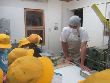 店主の今村さんが快く工房に案内して下さり、パン焼き釜やパイ生地伸ばし機等、様々な機械や道具について一つ一つ丁寧に説明しながら見せてくださいました。