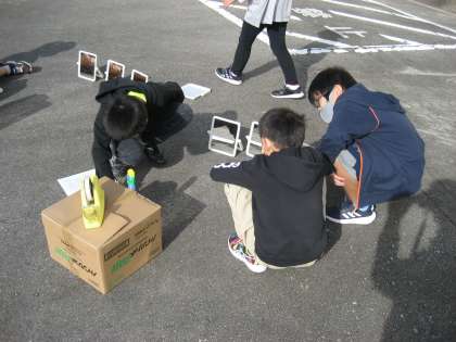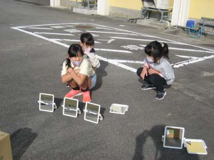 3年生は、理科の学習で光の実験をしました。鏡を使ってはね返した日光が当たったところの温度や明るさがどのようになるか、それぞれが自分なりに結果を予想しました。実験では3枚の鏡で試み、確かめました。最後に3年生みんなで光を集めてみたら、その明るさにみんな驚いていました。