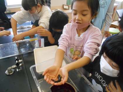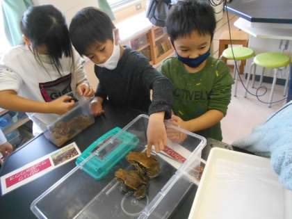8日(月)に、1・2年生合同で悠久の森出前講座を行いました。子供たちは、古沢に住んでいる生き物と触れ合うことができました。おそるおそる触っている子供やかわいいとやさしく触っている子供の姿が見られました。