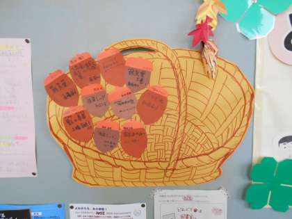 どんぐりの画用紙に自分のおすすめの本を書いて紹介するスペースも埋まってきました。