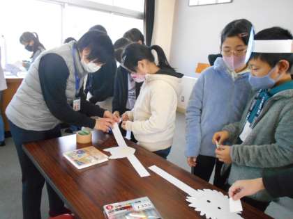 子供たちは、教え合いながらすてきなお面に仕上げました。