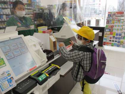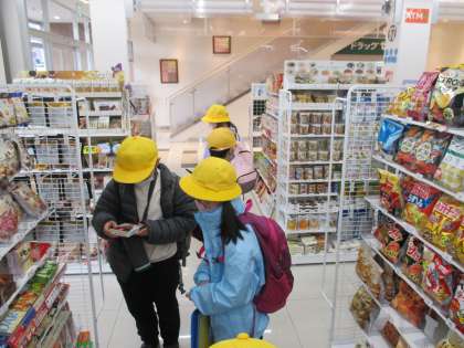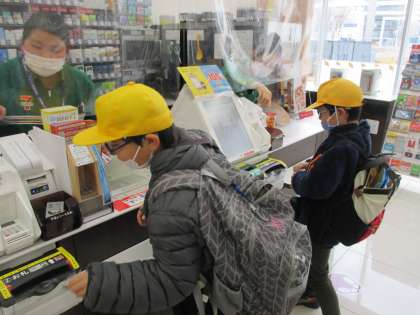富山駅に着いたら、本日のお楽しみのお買い物体験です。コンビニエンスストアでそれぞれ好きなお菓子を一つずつ選んで購入しました。最近、多く普及しているセミセルフレジによる購入も体験できました。