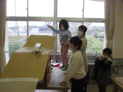 2年生の生活科では、前単元で行った「動くおもちゃ作り」で製作したおもちゃを使って、「わくわくランド」の学習を行いました。今日は、完成したわくわくランドに、校長先生と1年生を招待しました。