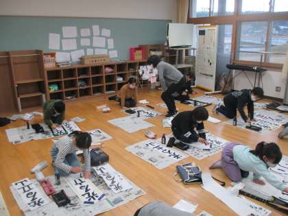 始業式の後に書初大会を行いました。3年生は「思いやり」、4年生は「光る立山」の文字を書きました。2学期の終わりや冬休みにたくさん練習してきたので、みんなとても上手になっていました。本番では練習の成果を発揮して、どの子もとてもよい字を書いていました。