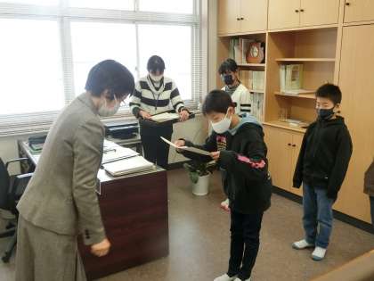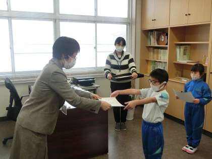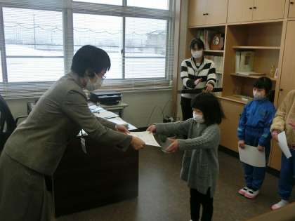 今日、書初大会の金賞・努力賞の受賞者は、校長先生から賞状をいただきました。賞状をもらった子供たちはとてもうれしそうでした。