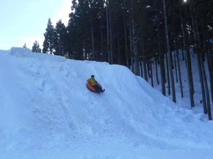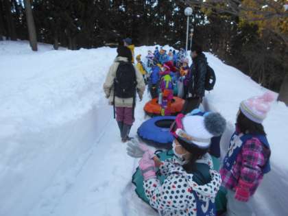 いよいよ外での活動が始まりました。スノーチューブを持ち、滑るところに行ってみると、想像を超える高さの坂を見て子供たちは、「大きい!」「すごい!」ととても驚いていました。