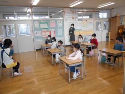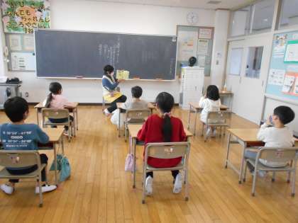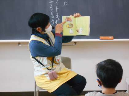 おいしい料理の出てくる物語でした。最後にどんなごちそうか当てるなぞなぞが出され、大盛り上がりの1年生でした。