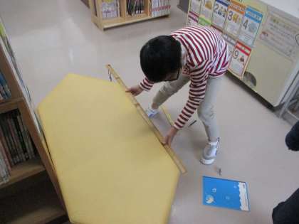 2年生では、「長さをはかろう」の学習で、1m以上の長さについて学習しています。今日は教室を飛び出し、それぞれが1mの竹尺をもって学校内にある1mに近い物を探しました。