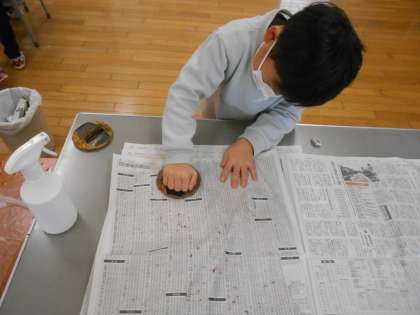 1年生は、図画工作科でカラータック紙版画を行いました。専用の用紙をぬらし、バレンをつかって刷りました。できあがった作品を見て、「色がたくさんがあってきれいだね!」と喜ぶ姿が見られました。