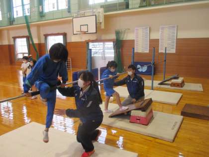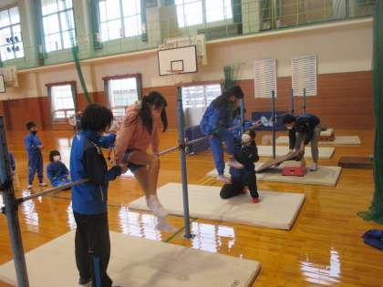 3・4年生は、足かけ回りの仕方を中心に教えていただきました。最初はできなかった子供たちも、部分ごとに練習していくうちにだんだんできるようになってきました。最後にはできるようになった子も何人かいて、とても有意義な時間となりました。