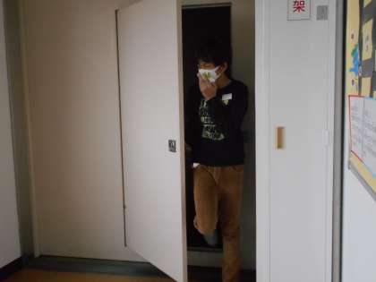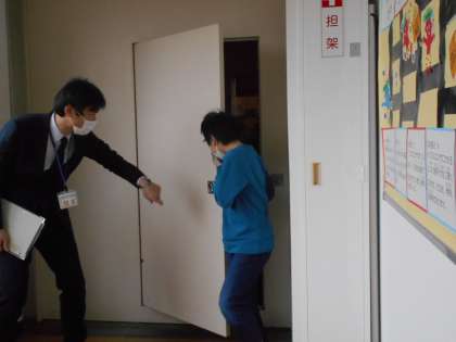 また、今回は、防火扉を実際に自分で開け、通過するという訓練も行いました。扉を通過するときには、足元に気を付け、順序よく避難するという約束を守り、安全に避難する子供たちの姿がみられました。