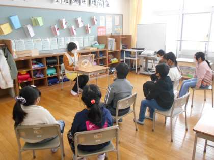 学校司書による読み聞かせがありました。今回は、紙芝居での読み聞かせでした。