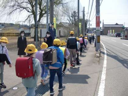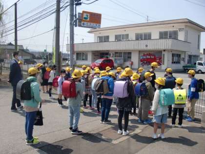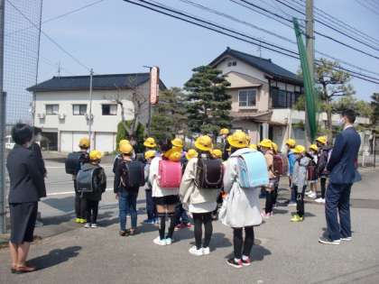 今日は新年度の始まりの日にふさわしい、とてもよい天気です。少し風が吹いていますが、子供たちは一日目の学習を終え、地区ごとに元気に帰っていきました。2年生の担任が、子供たちと登下校の安全について確認し、しっかりと一列で歩いて行きました。
