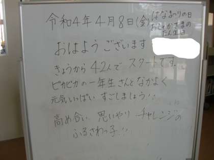 今日もとてもよい天気です。昨日の入学式を終え、1年生がいる登校班では、1年生のペースに合わせて歩いている上級生の姿が微笑ましいです。