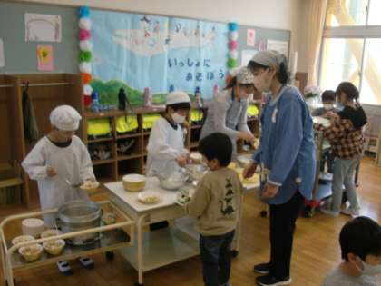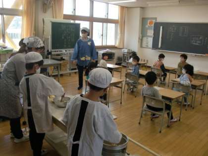 今日は、1年生が初めての給食です。2年生が配膳の仕方を教えてくれました。古沢小学校の給食は、調理員さんが心を込めて作ってくださるので、とてもおいしいですよ!エプロン、三角巾を身に着けて、自分たちで準備をします。好き嫌いを無くして、栄養たっぷりの給食をもりもり食べましょう!