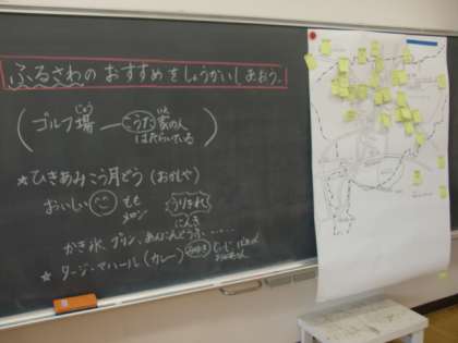 2年生は生活科の学習で、古沢地区のお気に入りの場所や興味のある出来事、地域の様々な人等について、互いに紹介し合っています。古沢地区の地図の中は、おすすめの付箋でいっぱいです!