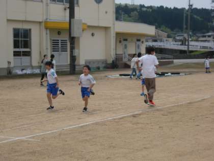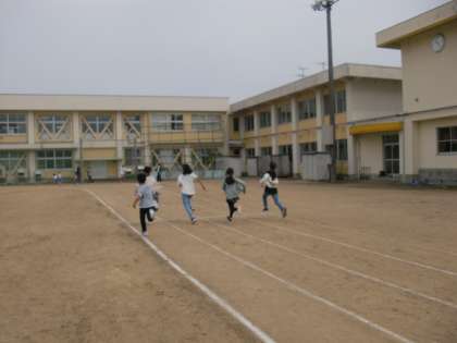 今日は少し風が吹いていますが、今年度初めての「チャレンジ活動」を行っています。今日は学年ごとに50mを走りました。低学年は6年生のお兄さんと一緒に走ることができて嬉しそうです。毎週月・木曜日の業間時に、いろいろな運動にチャレンジし、体力アップを図ります!