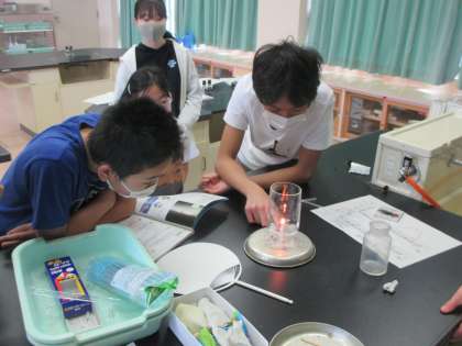 理科室で「物の燃え方」の実験をしています。