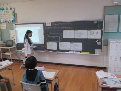 4月22日(金) 5年 算数科「直方体や立方体のかさの表し方を考えよう」 公開日 2022/04/22 更新日 2022/04/22 5年 5年生は、算数科の授業で「直方体」や「立方体」の学習をしています。 大きなものの体積の表し方を考えた後、1m物差しを使って、みんなで実際に立方体を作ってみました。協力して作った立方体の中に入ると、大きなものの体積を体全体で実感することができました!