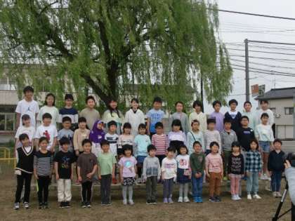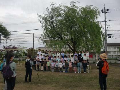 みんなで、柳の木の下で記念写真を撮りました。マスクを外して静かに、みんなすてきな笑顔です。