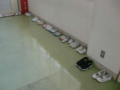 1枚目の写真は、絨毯カーペットの視聴覚室で学習を進めている子供たちのズックの様子です。見ていても大変気持ちがよく、美しい心がここにも現れていますね。まずは自分の足元からですね。