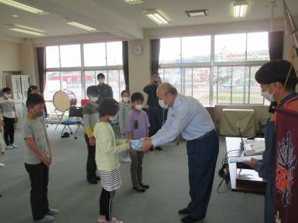 呉羽消防署の方々が来られ、BFCのバッジ授与式を行いました。これからの活動について、校長先生と消防署の方からのお話を聞いた後、バッジをいただきました。