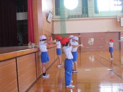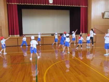 運動会で最初に披露する体操「レッツゴーいいことあるさ」の練習をしています。2年生が1年生のお手本になって、音楽に合わせて行いました。1年生も手の先をぴんと伸ばしたり、リズムに合わせて元気にジャンプしたりしながら、いろいろな動きに挑戦しました。運動会がますます楽しみになった1・2年生です!