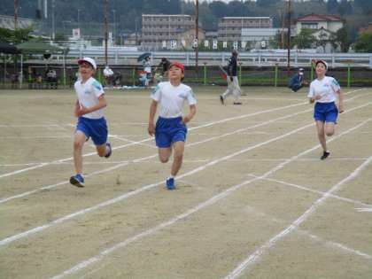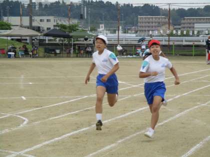 6年生は、小学校生活最後の運動会での80m走です。力強いフォームで、みんな一生懸命に走っています!