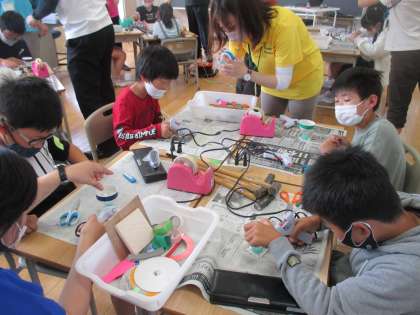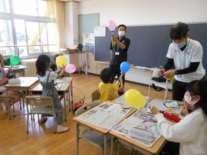 3・4年生は、風船ホバークラフト作りをしました。空気の不思議な力を利用して動くホバーに子供たちは大興奮でした!最後は、大きなホバーにも乗せてもらい、子供たちは大喜びでした!