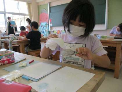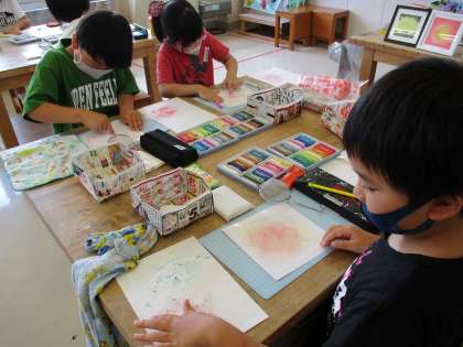今年も古沢小学校チャレンジプロジェクトの一環として、パステル画教室を行いました。2年生は、昨年度も講師の先生から楽しく教わった経験を思い出しながら、今年もまた活動ができることにわくわくしていました。1年生は、初めてのパステル画教室でしたが、茶こしを使って上手にパステルを粉にし、指で塗ることを楽しんでいました。粉のさらさらとした質感を楽しみながら、子供たちは素敵な作品を完成させることができました。