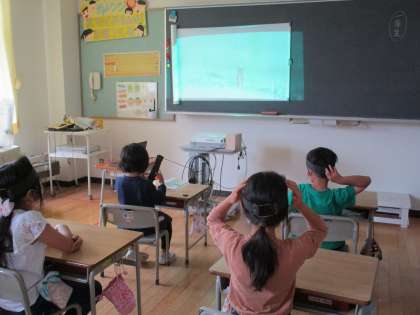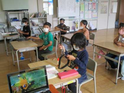 6月7日(火) 2年 国語科「スイミー」 公開日 2022/06/07 更新日 2022/06/07 2年 国語科では、スイミーの学習が始まりました。2年生は、昨年度の学習発表会でスイミーの劇をしたため、国語で学習することを楽しみにしていました。 今日は、手作りのお面を被り、海の中の動画を見ました。明るい海の様子に、子供たちはわくわく!「いい気持ちだね。」「魚がたくさんいて楽しいよ。」と、スイミーになりきって感想を述べていました。