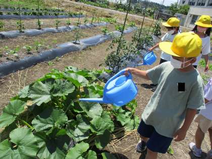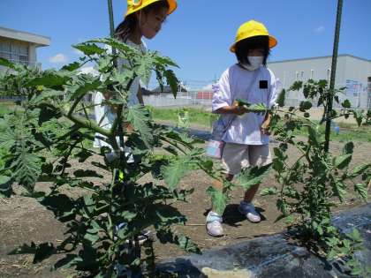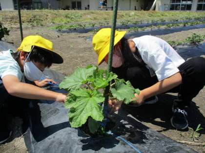 生活科の学習で育てている野菜が、どんどん大きくなっています。毎朝畑に水やりに行き、野菜の成長を目の当たりにしている子供たちは、日毎に新しい発見をしています。