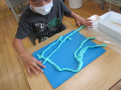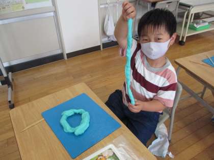 6月21日(火) 1年 図画工作科「ひもひもねんど」 公開日 2022/06/21 更新日 2022/06/21 最新の出来事 粘土でいろいろな形を作りました。手を器用に動かしながら、丸いボールのような形、せんべいみたいな形、くるくる丸めた形、紐のような長い形等、子供たちは様々な形作りを楽しみました。また、紐のような形の粘土を自由に組み合わせて、いろいろなものを工夫して作りました。子供たちの発想はますます広がり、とても楽しい時間になりました。